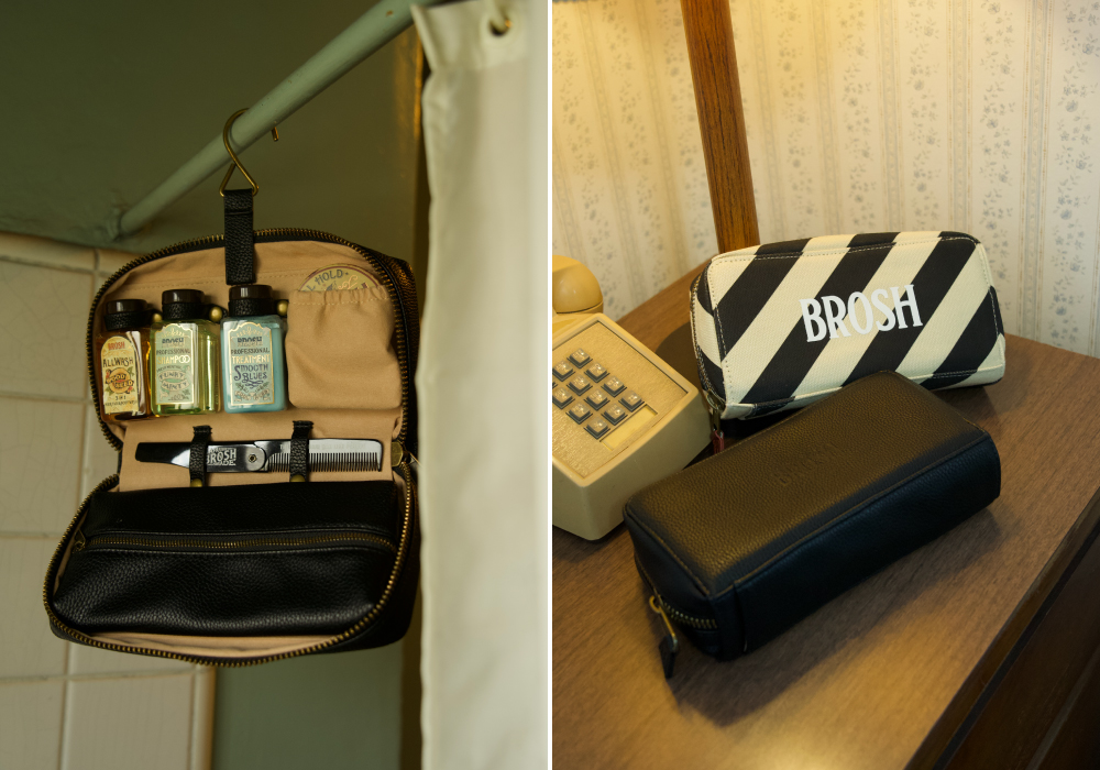 シャンプー、トリートメント、オールウォッシュ、ポマード、そしてコームを一式収納した専用ポーチは、上質なレザーと軽やかなキャンバスの2タイプから選択可能。